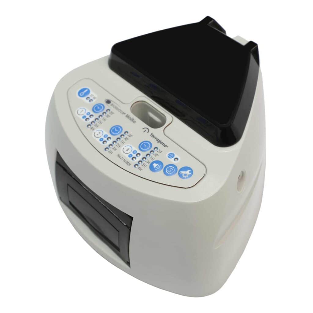 This auto-reader incubator accommodates three BT110 Biological Indicators and includes a built-in ampoule crusher, a dedicated port for an external thermometer, and an incorporated top cap for secure operation. Equipped with a thermal printer, it automatically records results at the end of each incubation cycle. It also features automatic detection and cancellation of fluorescence readings, and an audible alarm for event indication.