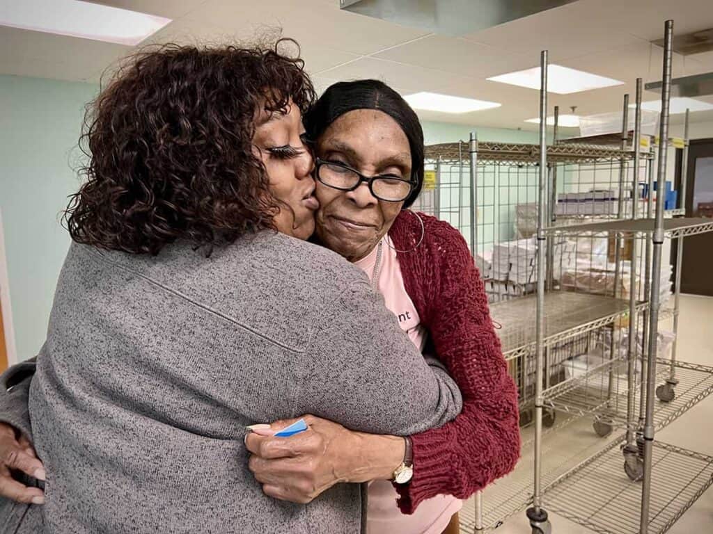 Flora Slade, Consumables, (right) gets a big hug from her daughter, Gena, who works in Accessories. Flora, 86, joined Andersen in 2020. She says working keeps her young.